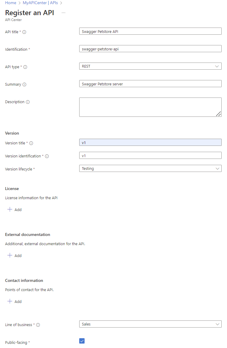الإعداد القيمة Description عنوان واجهة برمجة التطبيقات أدخل Swagger Petstore API. الاسم الذي تختاره لواجهة برمجة التطبيقات تعريف بعد إدخال العنوان السابق، يقوم Azure API Center بإنشاء هذا المعرف، والذي يمكنك تجاوزه. اسم مورد Azure لواجهة برمجة التطبيقات نوع واجهة برمجة التطبيقات حدد REST من القائمة المنسدلة. نوع واجهة برمجة التطبيقات الملخص أدخل ملخصا اختياريا. وصف موجز لواجهة برمجة التطبيقات وصف أدخل وصفا اختياريا. وصف واجهة برمجة التطبيقات الإصدار عنوان الإصدار أدخل عنوان إصدار من اختيارك، مثل v1. الاسم الذي تختاره لإصدار واجهة برمجة التطبيقات تعريف الإصدار بعد إدخال العنوان السابق، يقوم Azure API Center بإنشاء هذا المعرف، والذي يمكنك تجاوزه. اسم مورد Azure للإصدار دورة حياة الإصدار حدد من القائمة المنسدلة، على سبيل المثال، الاختبار أو الإنتاج. مرحلة دورة حياة إصدار واجهة برمجة التطبيقات وثائق خارجية إضافة ارتباط واحد أو أكثر إلى الوثائق الخارجية اختياريا. اسم ووصف وعنوان URL للوثائق الخاصة بواجهة برمجة التطبيقات الترخيص إضافة معلومات الترخيص اختياريا. الاسم وعنوان URL ومعرف ترخيص واجهة برمجة التطبيقات معلومات جهة الاتصال إضافة معلومات لجهات اتصال واحدة أو أكثر اختياريا. اسم جهة اتصال لواجهة برمجة التطبيقات والبريد الإلكتروني وعنوان URL لها خط العمل إذا أضفت بيانات التعريف هذه في البرنامج التعليمي السابق، فتحقق من القائمة المنسدلة، مثل Marketing. بيانات وصفية مخصصة تحدد وحدة الأعمال التي تمتلك واجهة برمجة التطبيقات مواجهة عامة إذا أضفت بيانات التعريف هذه، فحدد خانة الاختيار. البيانات الوصفية المخصصة التي تحدد ما إذا كانت واجهة برمجة التطبيقات عامة أو داخلية فقط حدد إنشاء لتسجيل واجهة برمجة التطبيقات.