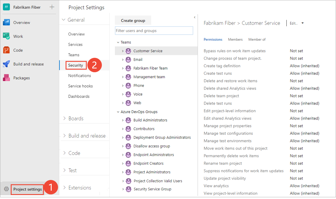 https://dev.azure.com/{Your_Organization}/{Your_Project}).Select Project settings > Permissions.