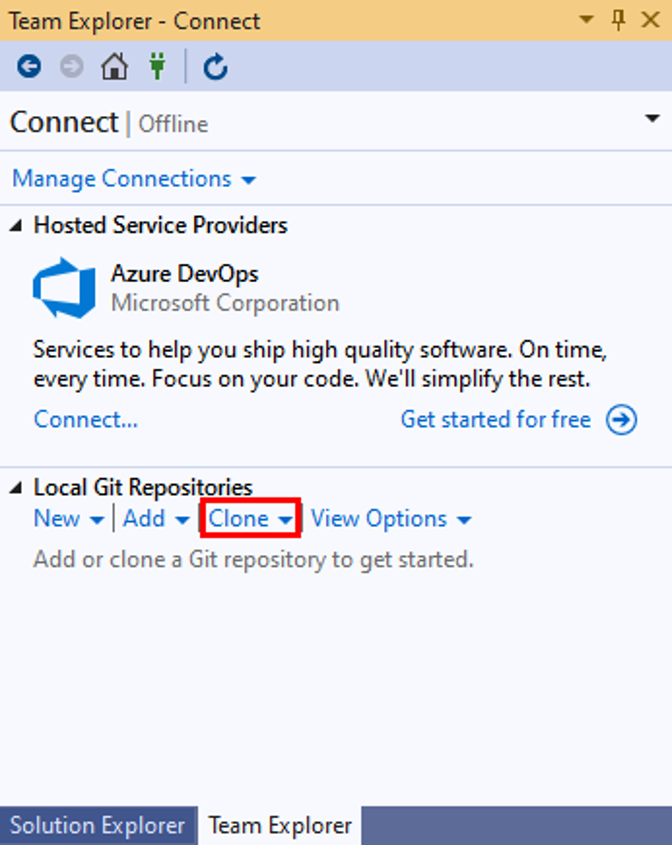 In the Connect to a Project window, sign in to Azure DevOps and choose the remote repo you want to clone. You can use the search box to filter the list of remote repos. If you don't see the remote repo, select Add Azure DevOps Server to add the server that hosts the repo. Verify the local folder path where you want the local clone to be created, and then select Clone.