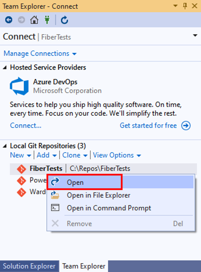 After you've cloned a remote Git repo, Visual Studio detects the local clone and adds it to the list of Local Repositories in the Git menu.