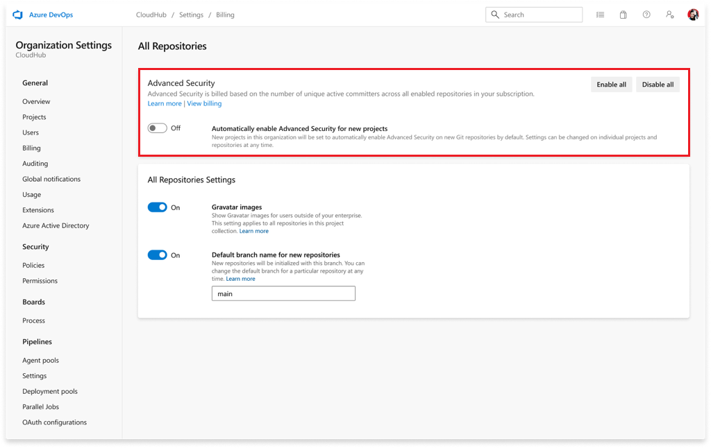 - Select Begin billing to activate Advanced Security for every existing repository in each project in your organization.