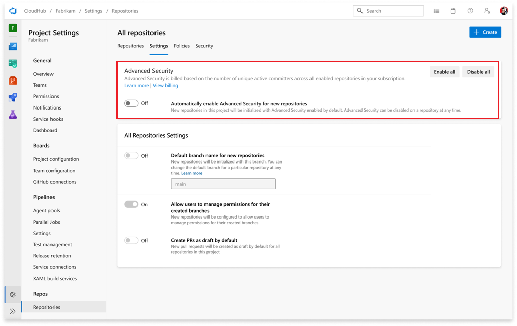 - Optionally, select Automatically enable Advanced Security for new repositories so that any newly created repositories in the future have Advanced Security enabled upon creation. This setting is separate from the Enable all action and must be selected independently.