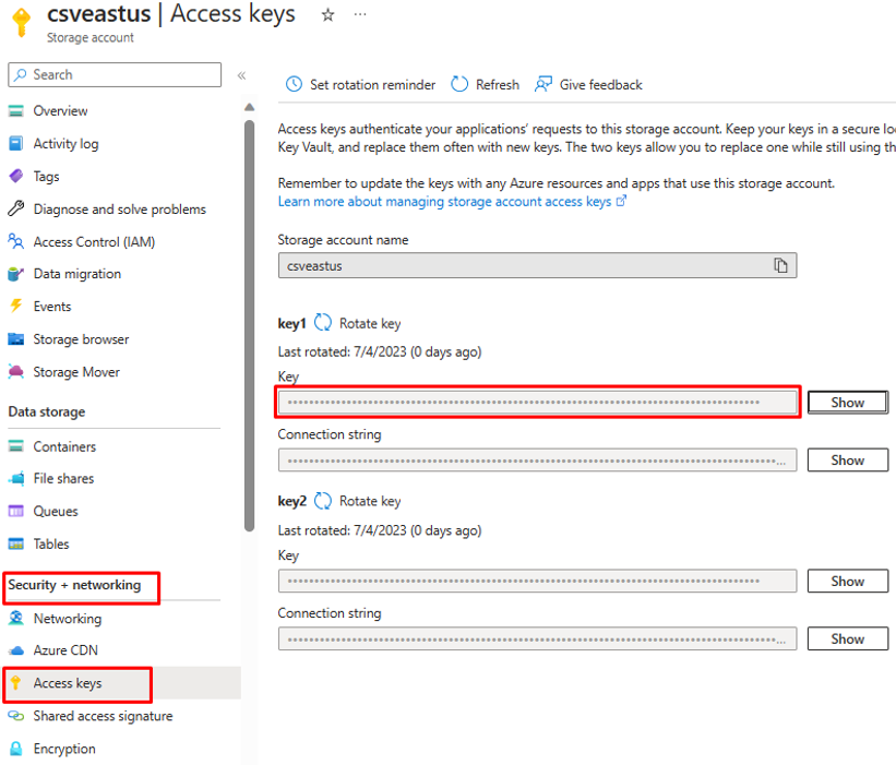 Azurefile_access Keyparameter, open your Azure file storage account and copy the access key present under "Security and Networking".