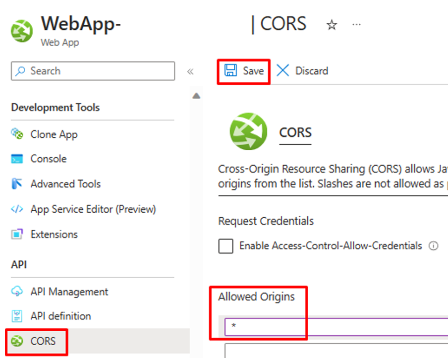 To allow Logic Apps to invoke this Azure Function, in the CORS setting for the WebApp enter asterisk (*) and "Save" the configuration.