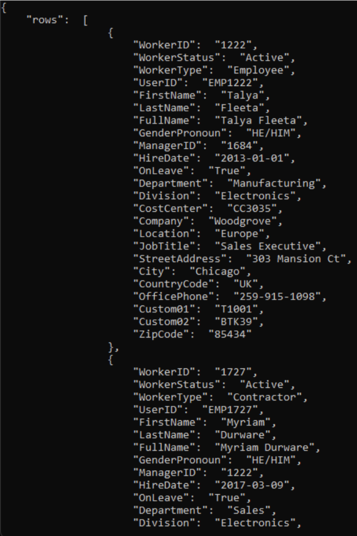 $csvFilePathand$uriin the script.# Step 1: Read the CSV file $csvFilePath = "C:\Path-to-CSV-file\hr-user-data.csv" $csvContent = Get-Content -Path $csvFilePath # Step 2: Set up the request $uri = "https://az-function-webapp-your-domain/csvtojson" $headers = @{ "Content-Type" = "text/csv" } $body = $csvContent -join "`n" # Join the CSV lines into a single string # Step 3: Send the POST request $response = Invoke-WebRequest -Uri $uri -Method POST -Headers $headers -Body $body # Output and format the JSON response $response.Content | ConvertFrom-JSON | ConvertTo-JSONIf the Azure Function deployment is successful, then the last line of the script outputs the JSON version of the CSV file.