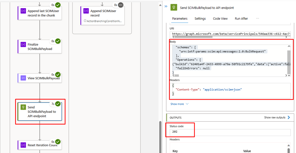 In the step "Send SCIMBulkPayload to API endpoint", ensure you're using the right API endpoint and authentication mechanism.