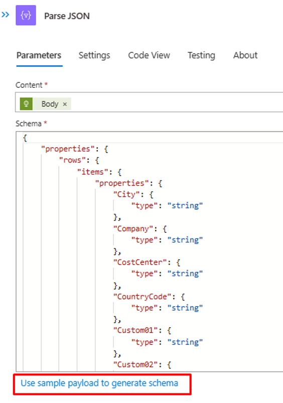 If your CSV file content / headers is different, then update the "Parse JSON" step with the JSON output that you can retrieve from your API call to the Azure Function. Use PowerShell output from Step 2.