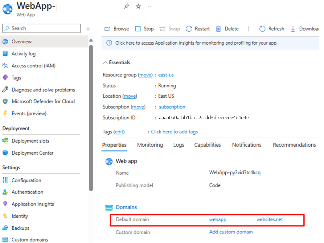 Go to the resource group and open the WebApp configuration. Ensure it's in "Running" state. Copy the default domain name associated with the Web App.