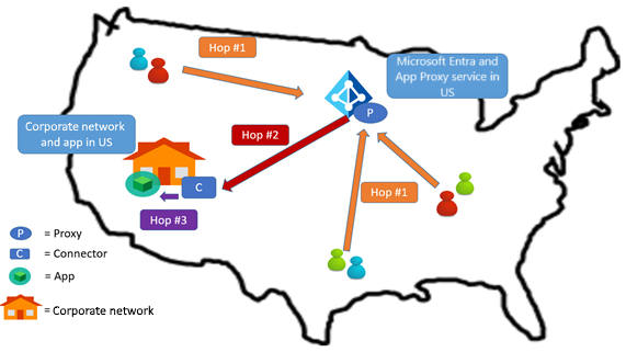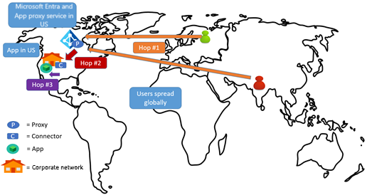 Because Europe users are accessing an application proxy instance that happens to be in the same region, hop 1 isn't expensive. Hop 3 is optimized. Consider using ExpressRoute to optimize hop 2.