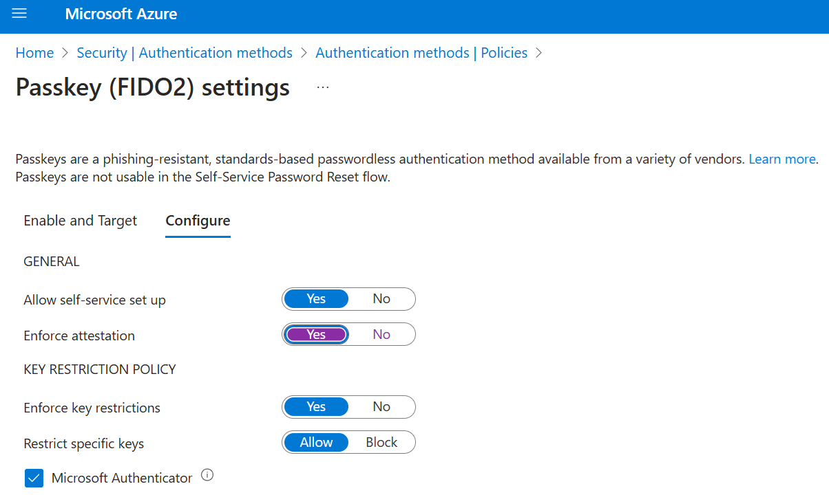 Set Enforce attestation to Yes or No. Users can only register attested passkeys directly in the Authenticator app. Cross-device registration flows don't support registration of attested passkeys.