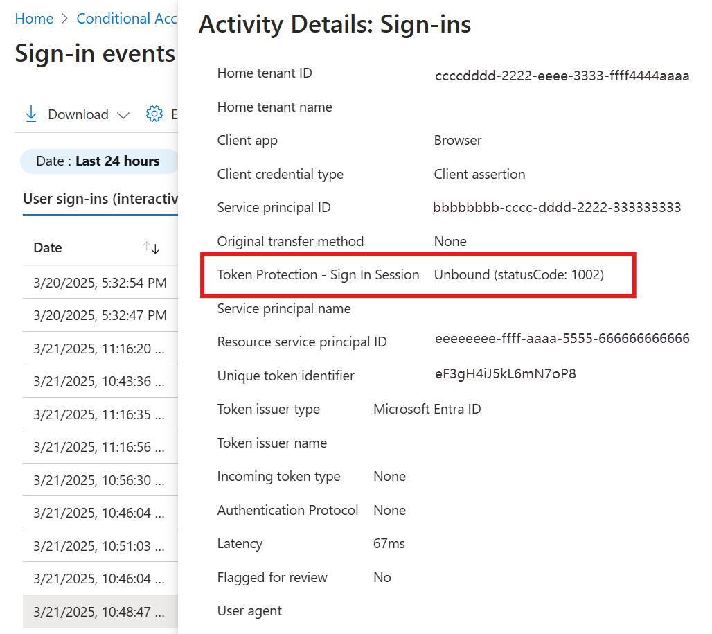 - Bound: the request was using bound protocols. Some sign-ins might include multiple requests, and all requests must be bound to satisfy the token protection policy. Even if an individual request appears to be bound, it doesn't ensure compliance with the policy if other requests are unbound. To see all requests for a sign-in, you can filter all requests for a specific user or look by correlation ID.