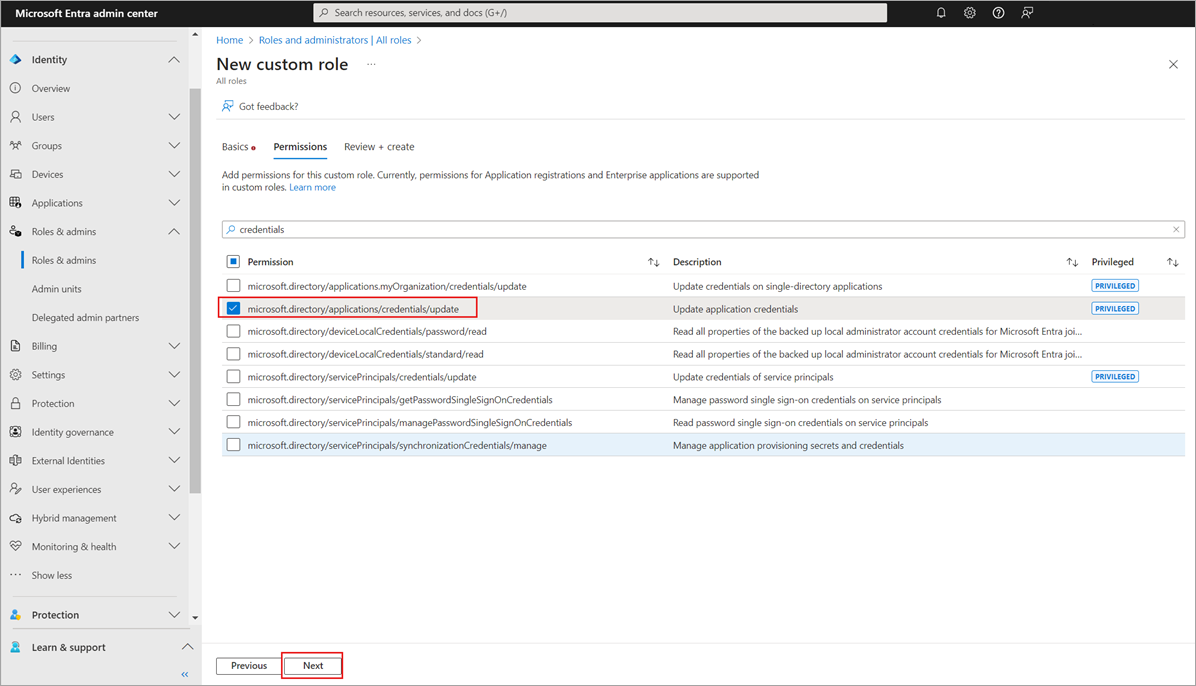 First, enter "credentials" in the search bar and select the microsoft.directory/applications/credentials/update permission.