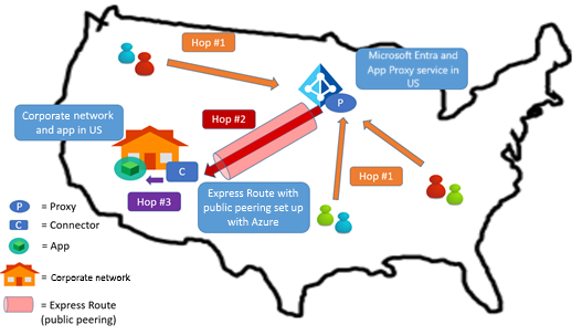 Scenario: The app is in an organization's network in the US, with users in the same region. No ExpressRoute or VPN exists between the Azure datacenter and the corporate network.