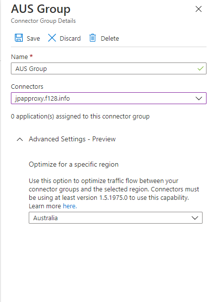 If you have connectors installed in regions different from your default region, it's beneficial to change which region your connector group is optimized for to improve performance accessing these applications. After a region is specified for a connector group, it connects to application proxy cloud services in the designated region.