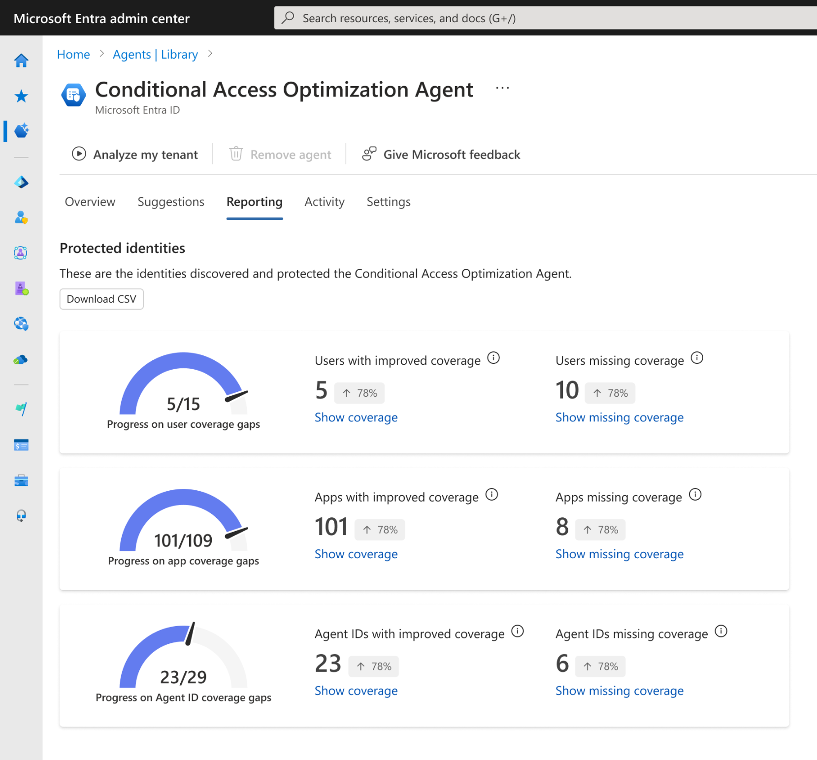 - Objects with improved coverage: Users, applications, or agent identities with critical policy gaps identified by the agent and are now covered by at least one new control in the past 30 days.