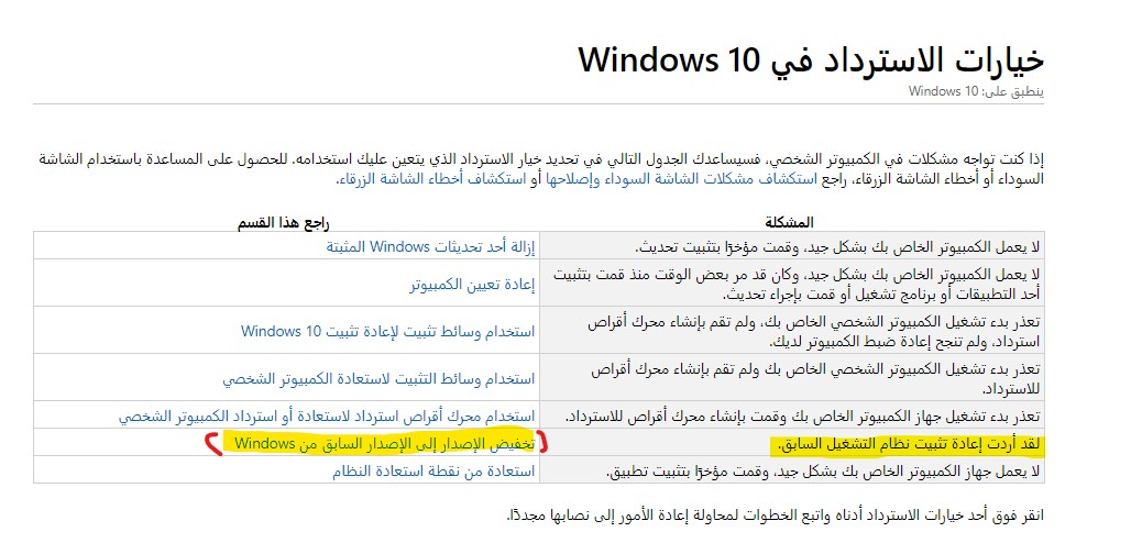 في مقال خيارات الاسترداد في Windows 10 ستجد جدول ومنه اختر لقد أردت إعادة تثبيت نظام التشغيل السابق ومنه الرجوع إلى الإصدار السابق من Windows. كما موضح في لقطة الشاشة المرفقة.