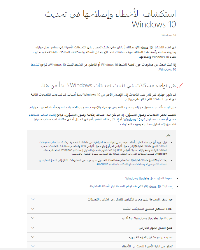 وكما انصحك أيضاً بالاطلاع على مقال استكشاف الأخطاء وإصلاحها في تحديث Windows 10ومواصلة اتباع كل خطوات الحل الاضافية المتاحة من خلاله وتباعاً حسب ورودها في المقال، وحيث يمكنك الحصول على بعض من هذه الخطوات في لقطة الشاشة التالية: