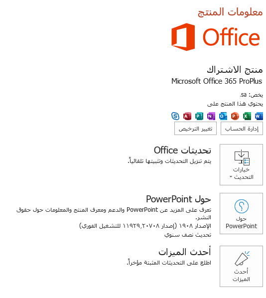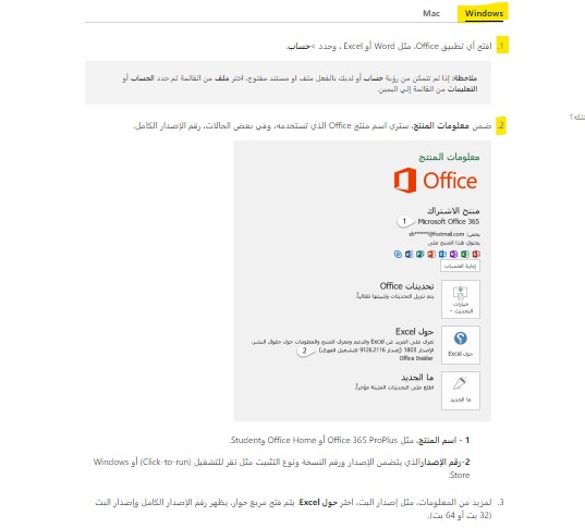 - تأكيد اصدار Office المستخدم لديك من خلال ارسال لقطة شاشة لمعلومات المنتج. لمعرفة اصدار Office ، اضغط هنـــــــــــــا و كما موضح فى الصورة المرفقة.