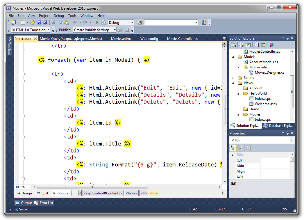 We won't be implementing Edit, Details and Delete functionality with this application - so we don't need the default links that the scaffold template created for us. Open up the /Movies/Index.aspx file and remove them.