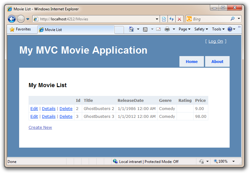 We now have a simple listing of our movie data. However, if we click the "Create New" link, we'll get an error as it's not hooked up! Let's implement a Create Action method and enable a user to enter new movies in our database.