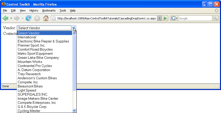 Load the ASP.NET page, and after a short while the vendor list is filled with 25 entries. Pick one entry and notice how the second dropdown list is filled with data.