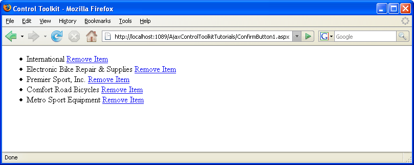 This data source can then be used within a repeater. As usual, the DataBinder.Eval() method retrieves data from the data source. The ConfirmButtonExtender control must then be placed within the <ItemTemplate> section of the repeater so that it appears for every entry in the data source.