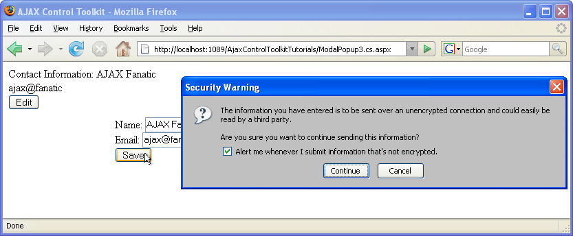 Also, the textbox controls within the modal popup should be filled with the current name and email. However this is only necessary when no postback occurs. If there is a postback, the ASP.NET viewstate feature will automatically fill the textboxes with the appropriate values.