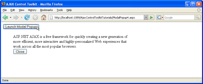 <asp:Button ID="btn1" runat="server" Text="Launch Modal Popup"