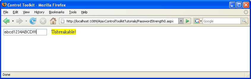 The StrengthIndicatorType provides the information how to present the strength of the password, as text (value "Text") or as a kind of progress bar (value "BarIndicator"). In the DisplayPosition attribute, you configure where the information appears. Here is a complete example, including the ASP.NET AJAX ScriptManager control, the PasswordStrength control and of course a text box where the user may enter a password. For the sake of demonstration, the latter form field is a regular text field and not a password field so that you can see during development what you are typing.