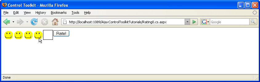 First of all, you need (at least) two kinds of images: one for a filled out rating item, and one for an empty rating item. A rating item is usually a star or a smiley. For this scenario, you find three files, smiley.png and empty.png and smiley-done.png as part of the source code downloads for this tutorial.