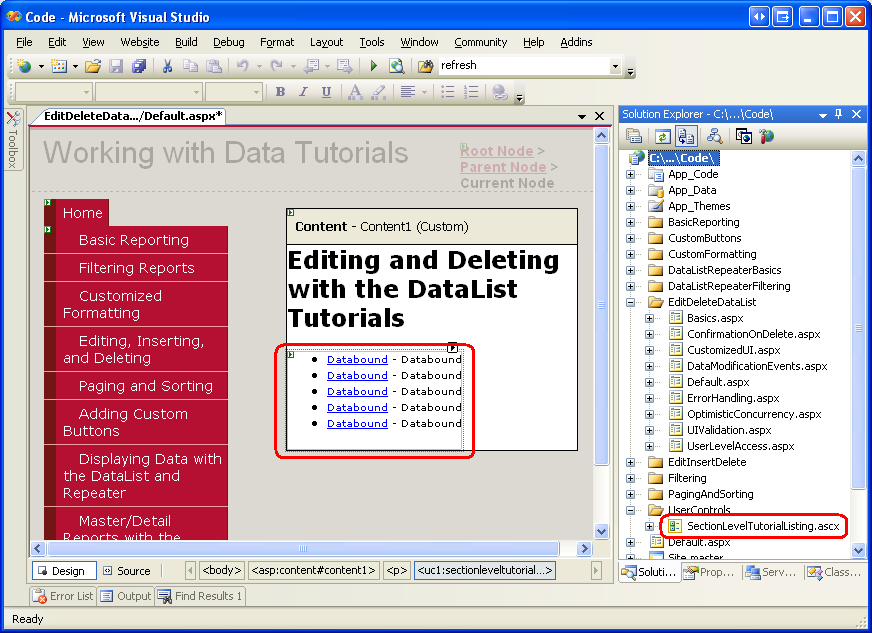 Like in the other folders, Default.aspx in the EditDeleteDataList folder lists the tutorials in its section. Recall that the SectionLevelTutorialListing.ascx User Control provides this functionality. Therefore, add this User Control to Default.aspx by dragging it from the Solution Explorer onto the page s Design view.