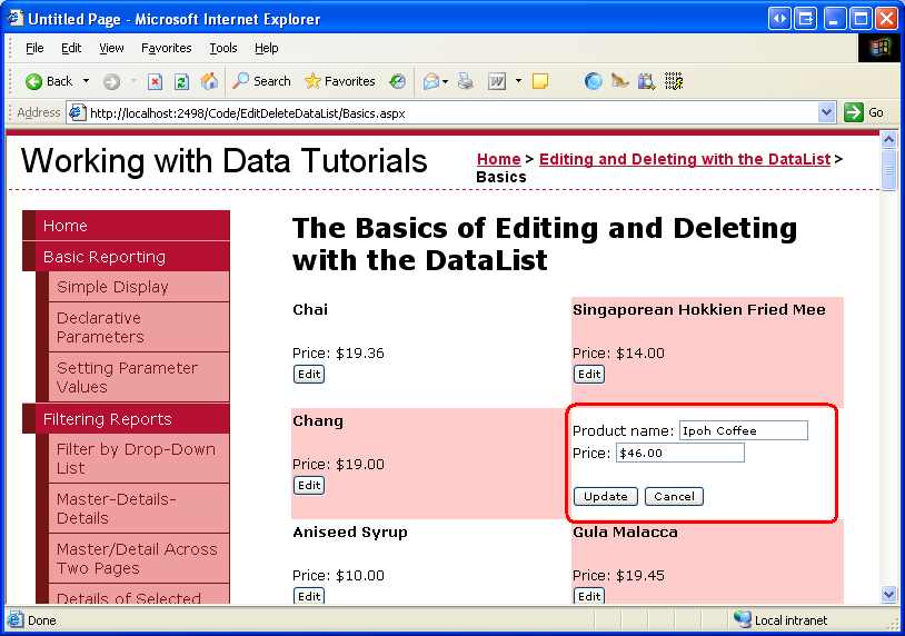 After updating Web.sitemap, take a moment to view the tutorials website through a browser. The menu on the left now includes items for the DataList editing and deleting tutorials.