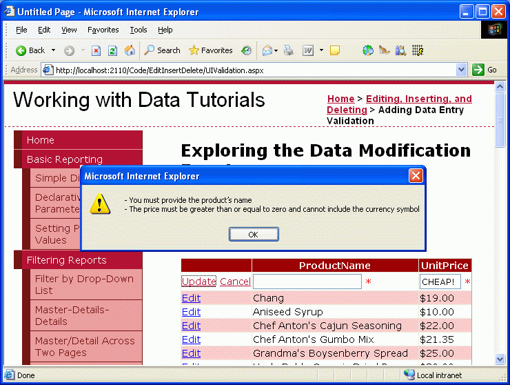 After moving over the content and code from DataModificationEvents.aspx to UIValidation.aspx, take a moment to test out your progress in a browser. You should see the same output and experience the same functionality in each of these two pages (refer back to Figure 1 for a screen shot of DataModificationEvents.aspx in action).