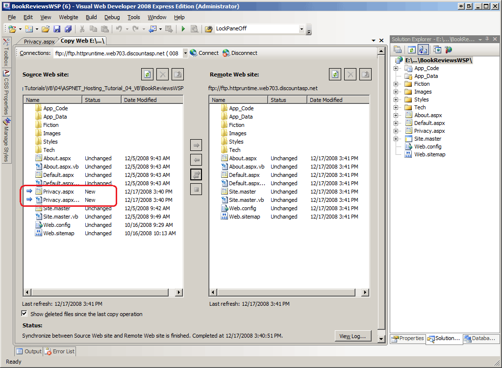 Figure 4: The Copy Web Site Tool Includes the New Privacy.aspx Page in its Left Pane (Click to view full-size image)