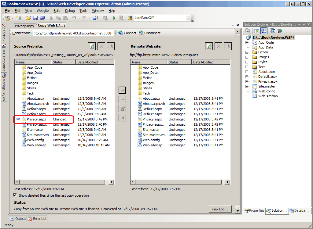 Figure 5: The Copy Web Site Tool Indicates that the Privacy.aspx Page has been Changed (Click to view full-size image)