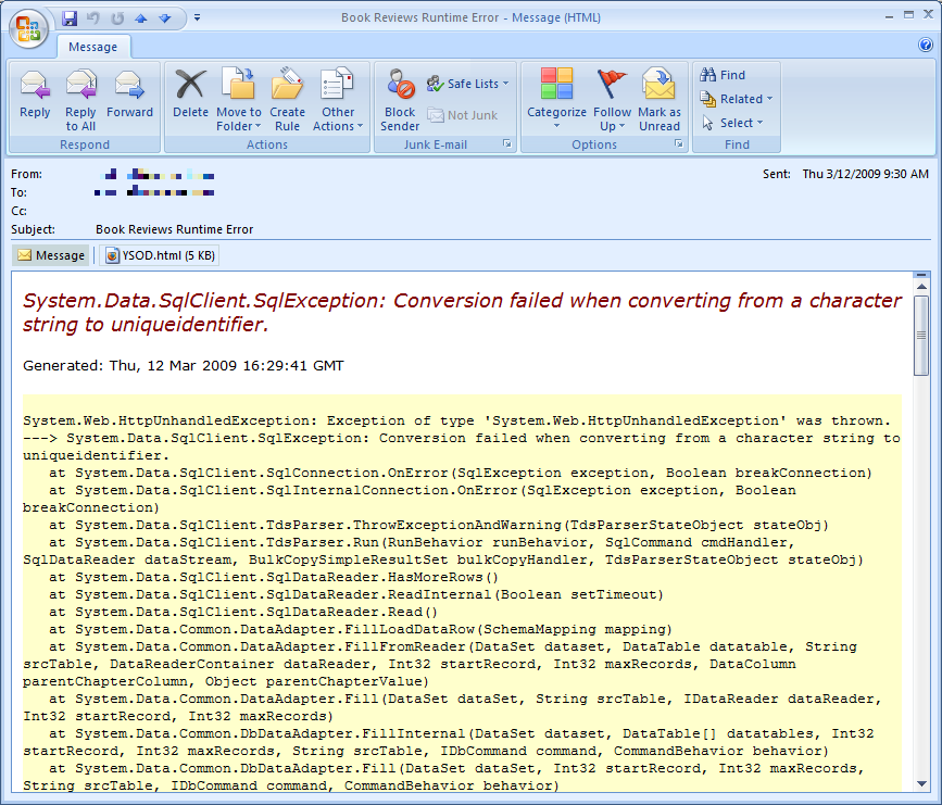 With the above settings in place, whenever a runtime error occurs ELMAH sends an email to support@example.com with the error details. ELMAH's error email includes the same information shown in the error details web page, namely the error message, the stack trace, and the server variables (refer back to Figures 4 and 5). The error email also includes the Exception Details Yellow Screen of Death content as an attachment (YSOD.html).