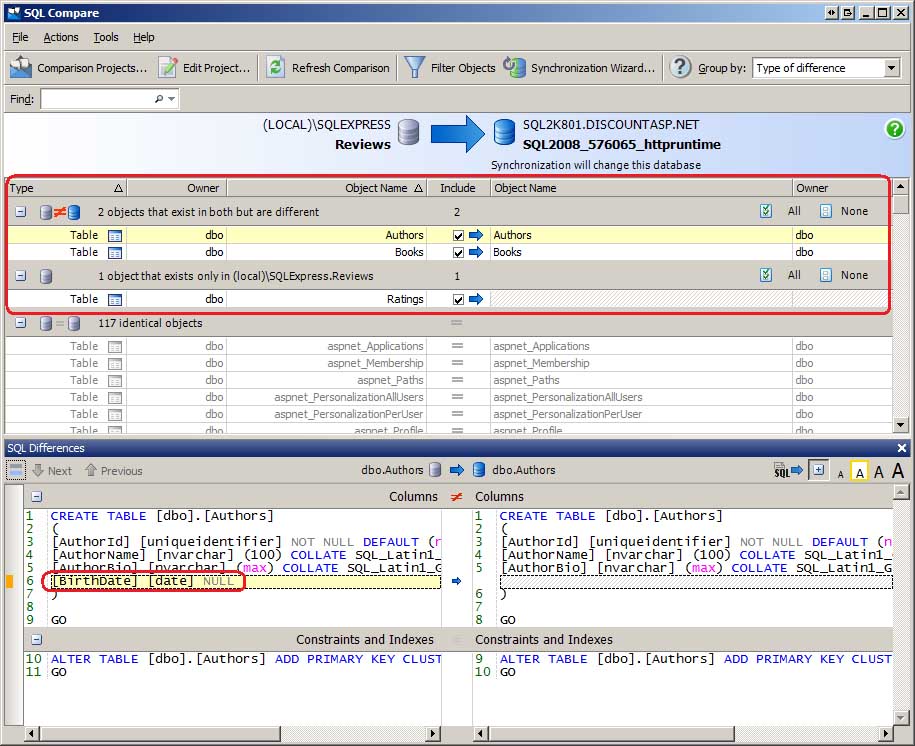 Selecting a database object displays the SQL Differences window, which shows how these objects differ. The SQL Differences window, displayed at the bottom in Figure 2, highlights that the Authors table in the development database has the BirthDate column, which is not found in the Authors table on the production database.