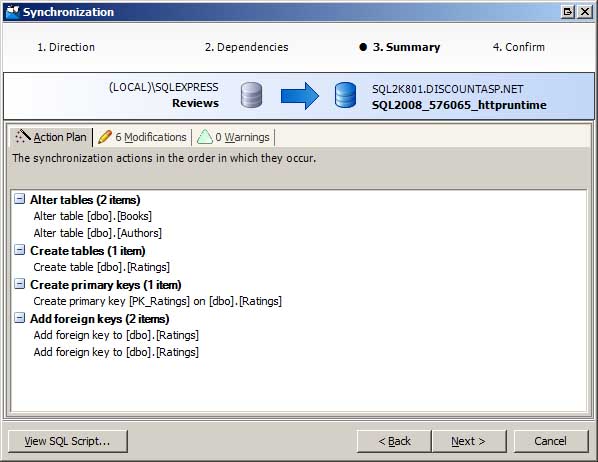 After reviewing the differences and selecting which objects you want to synchronize, the next step is to generate the SQL commands needed to update the production database s schema to match the development database. This is accomplished through the Synchronization Wizard. The Synchronization Wizard confirms what objects to synchronize and summarizes the action plan (see Figure 3). You can synchronize the databases immediately or generate a script with the SQL commands that can be run at your leisure.