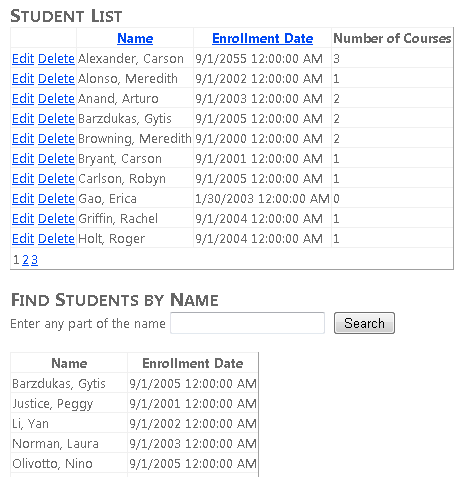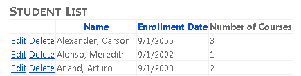 Open the Students.aspx page and in the StudentsGridView control replace the Name and Enrollment Date TemplateField elements with the following markup: