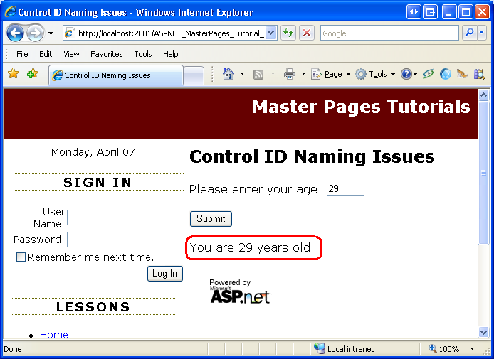 As noted earlier in this tutorial, both the master page and its ContentPlaceHolders serve as naming containers. Consequently, both contribute the rendered ID values of their nested controls. Take the TextBox's id attribute, for instance: ctl00_MainContent_Age. Recall that the TextBox control's ID value was Age. This is prefixed with its ContentPlaceHolder control's ID value, MainContent. Furthermore, this value is prefixed with the master page's ID value, ctl00. The net effect is an id attribute value consisting of the ID values of the master page, the ContentPlaceHolder control, and the TextBox itself.