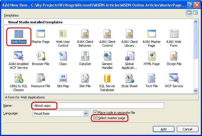 Let's add a new ASP.NET page to the project and bind it to the Site.master master page. Right-click on the project name in Solution Explorer and choose the Add New Item option. Select the Web Form template, enter the name About.aspx, and then check the "Select master page" checkbox as shown in Figure 7. Doing so will display the Select a Master Page dialog box (see Figure 8) from where you can choose the master page to use.