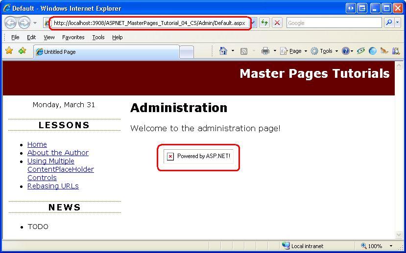 After making this change to the master page, revisit the ~/Admin/Default.aspx page again. This time the PoweredByASPNET.gif image file appears in the page (see Figure 3). When the Image Web control is rendered it uses the ResolveClientUrl method to resolve its ImageUrl property value. In ~/Admin/Default.aspx the ImageUrl is converted into an appropriate relative URL, as the following snippet of HTML source shows: