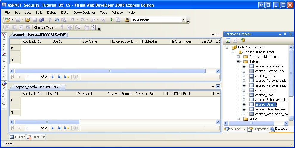 After creating a new user account, return to Visual Studio and examine the aspnet_Users and aspnet_Membership tables like we did in Figure 10 to verify that the account was successfully created.