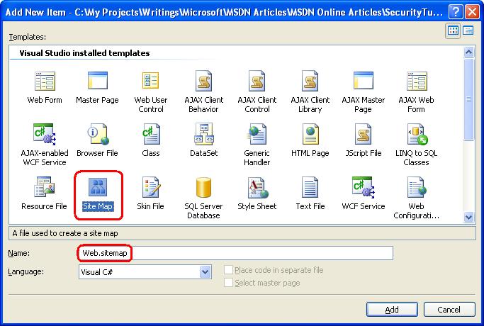 The default Site Map provider expects a properly-formatted XML file named Web.sitemap to exist the root directory. Since we are using this default provider, we need to add such a file and define the site map's structure in the appropriate XML format. To add the file, right-click on the project name in Solution Explorer and choose Add New Item. From the dialog box, opt to add a file of type Site Map named Web.sitemap.
