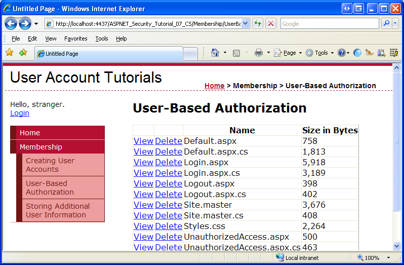 Currently, any authenticated or anonymous user can visit the UserBasedAuthorization.aspx page and view or delete files. Let's make it so that only authenticated users can view contents of a file and only Tito can delete a file. Such fine grain authorization rules can be applied declaratively, programmatically, or through a combination of both methods. Let's use the declarative approach to limit who can view the contents of a file; we'll use the programmatic approach to limit who can delete a file.