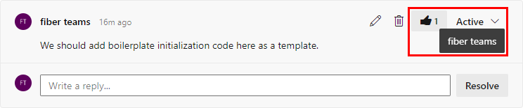 If you select Reply & resolve, the comment status will change to Resolved. PR authors can also directly change a comment's status, as described in the next section.
