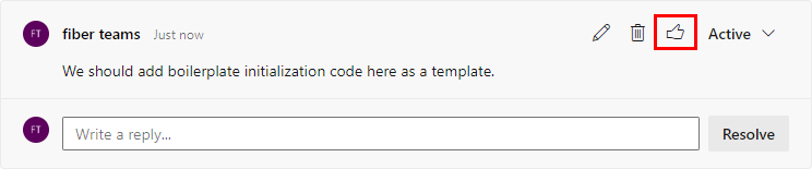 PR authors and reviewers can like their own or someone else's comment by hovering over the comment and choosing the thumbs-up icon: