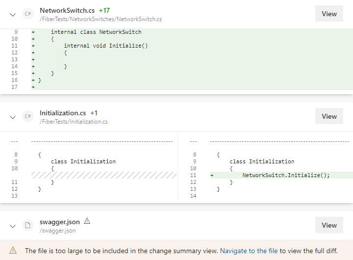 Select the Files tab to review all content changes in the PR's source branch. The initial view shows a summary view of all file changes. Choose the View button next to a file to view only that file's changes. If the file was modified, the View button opens a diff view. If the file was added or deleted, the View button opens a content pane.
