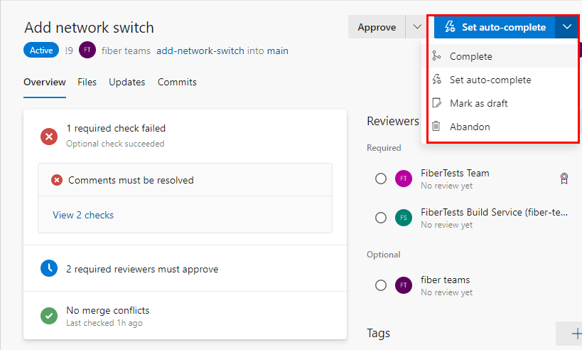 Complete: complete the PR now if all required reviewers have approved it and all required branch policies are met.