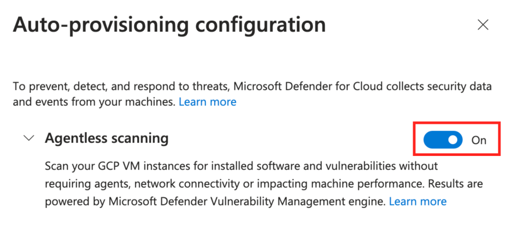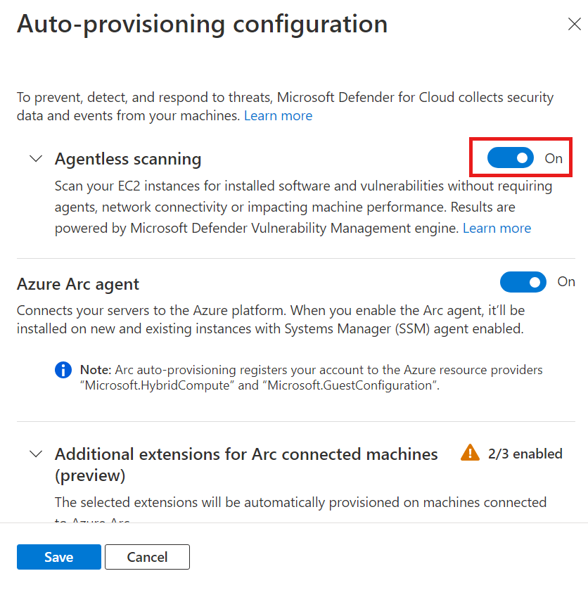 عند تشغيل خطة Defender for Servers الخطة 2 أو خطة Defender Cloud Security Posture Management (CSPM)، يتم تمكين فحص الجهاز بدون عامل بشكل افتراضي. إذا لزم الأمر، يمكنك استخدام الإرشادات الواردة في هذه المقالة لتمكين فحص الجهاز بدون عامل يدويا.